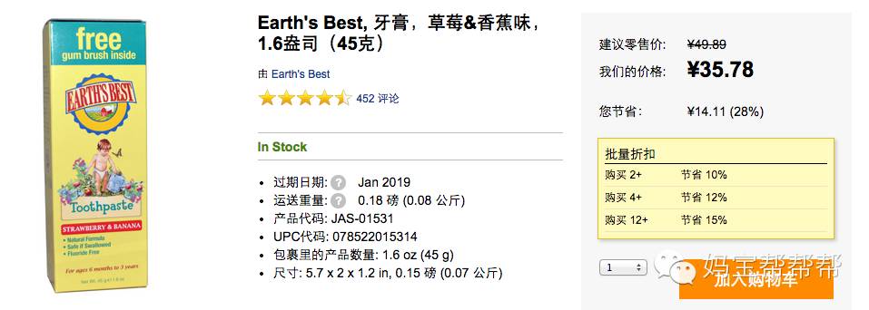 地球最好牙膏(送指套牙刷),适合6个月-3岁。从宝宝长出第一颗牙齿开始就要用牙膏刷牙了,虽然美国牙科学会推荐从出牙开始就使用含氟牙膏,但在美国的几个购物网站上很难找到2岁以下可吞咽的含氟牙膏,一般含氟牙膏都标注2岁以上使用。作为日常清洁,这款小牙膏也不错。不含氟、可吞咽的水果味。