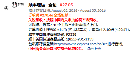 最后总结下:就是运输方式选顺丰,关税显示为0,结账的时候不会收取,到了国内也不会收取关税。也就是说,只要关税显示为0就是100%免收关税的。